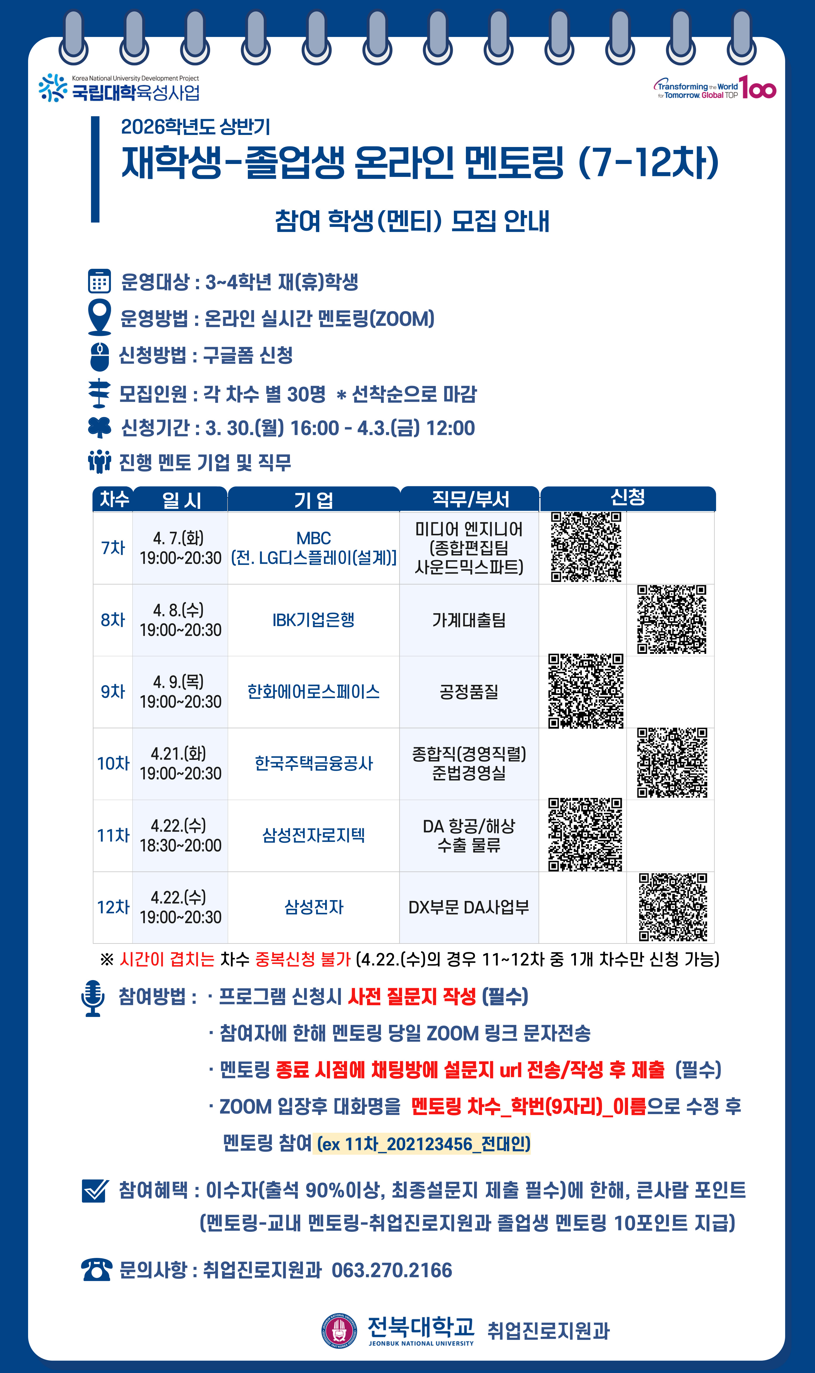 fnctId=bbs,fnctNo=2108 작성일 2026.03.31 수정일 2026.03.31 작성자 회계학과 조회수 35 재학생-졸업생 온라인 멘토링(7-12차) 신청 안내 첨부파일 첨부파일이(가) 없습니다.